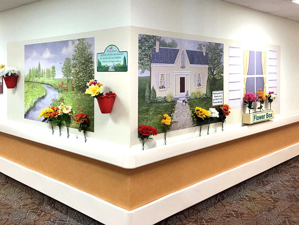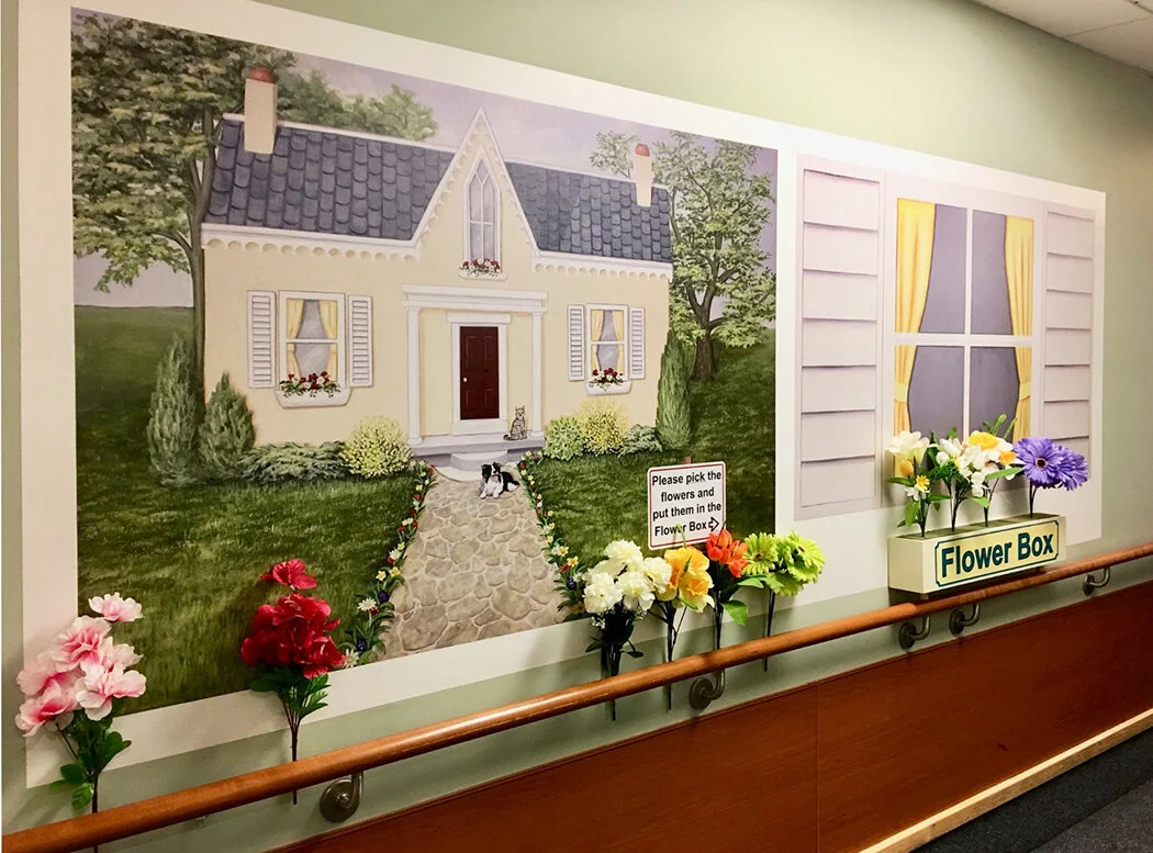 This corner mural is located opposite the nursing station where residents would ordinarily gather.
