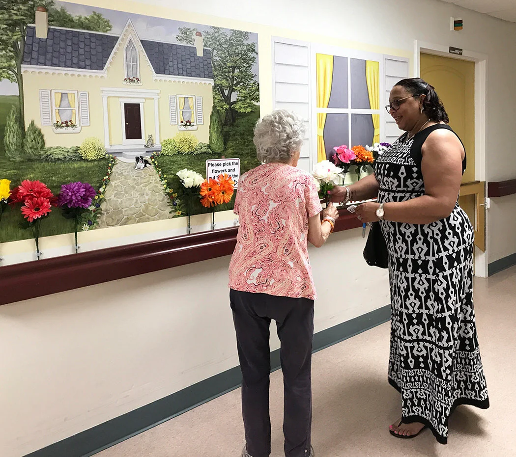 “Recently we had Karen and Brian come put up the Interactive Flower Mural and the residents, family and staff are really enjoying it! It not only brightens up the hallway, but almost immediately after installation, the residents were moving the flowers to the planter box. One woman stops several times a day to look at the panel with the field - her common expression is "Look at how lovely this is. Can we feed the deer later?" She enjoys looking at all the panels and often reads the writing. Karen and Brian are professional and show a real commitment to bettering the lives of our residents with advanced dementia. Wouldn't hesitate recommending them! We wish we could have these displays on all our home areas!"